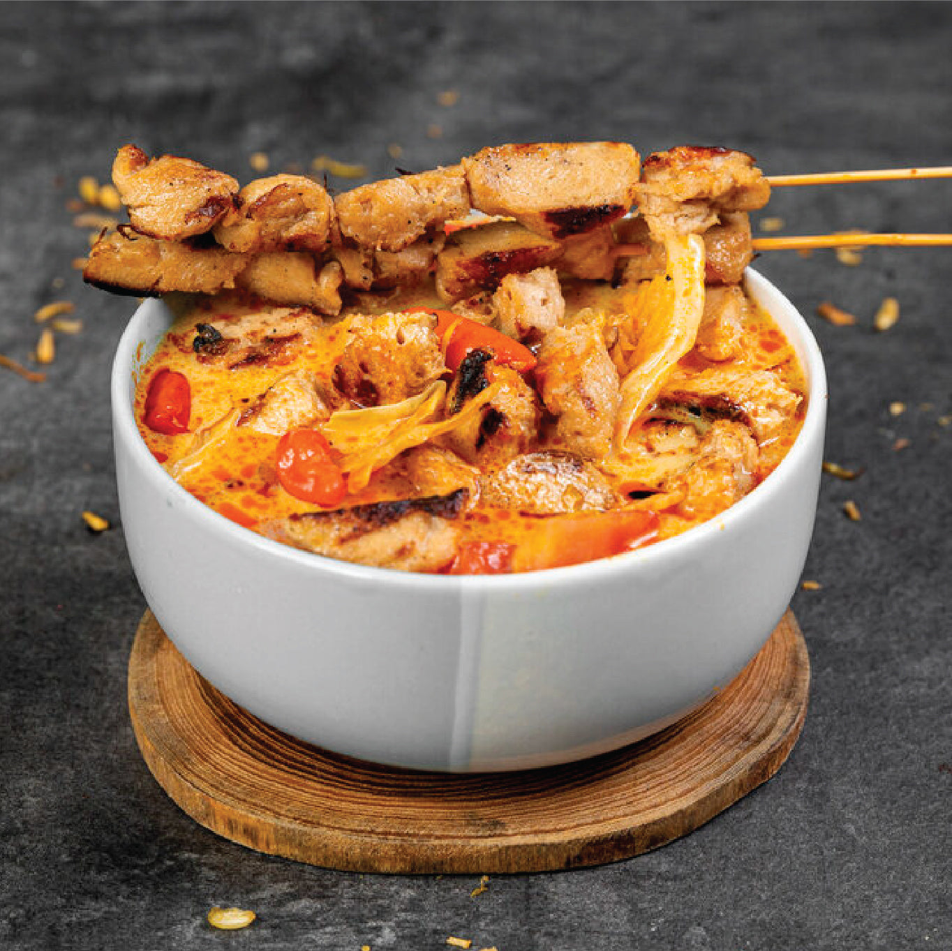 3. Preheat oil in a pot. Add the spice paste mixture and sautee for about 3 minutes. Add the herbs and saute until fragrant. Add Chick’n Satay pieces, cabbage leaves, seasonings, and water. Bring to a boil and lower the heat to let simmer for about 10 minutes.